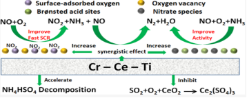 新型催化剂的设计及其应用是清洁化学技术团队的研究方向之一。在Ind. Eng. Chem. Res.的文章中,制备了Cr掺杂CeTi催化剂,该催化剂具有良好的低温活性和抗H2O及SO2中毒的性能。Cr的改性能有效提高催化剂的比表面积、氧空位、Ce3+的含量、表面酸性以及氧化还原能力,从而提升催化剂的低温活性和拓宽活性温度窗口。Cr掺杂CeTi催化剂形成更多的表面吸附氧,更易产生NO2,有利于“快SCR”反应。另外,Cr与Ce的电子转移也是CrCeTi催化剂具有优良催化活性的重要因素之一。采用In-situ-FTIR证实了该催化剂的反应遵循Eley-Rideal(E-R)机理。采用TG-MS证实Cr的掺杂减少催化剂表面吸附的SO2,促进硫酸氢氨的分解,因此显著地提高了催化剂的抗硫性能。