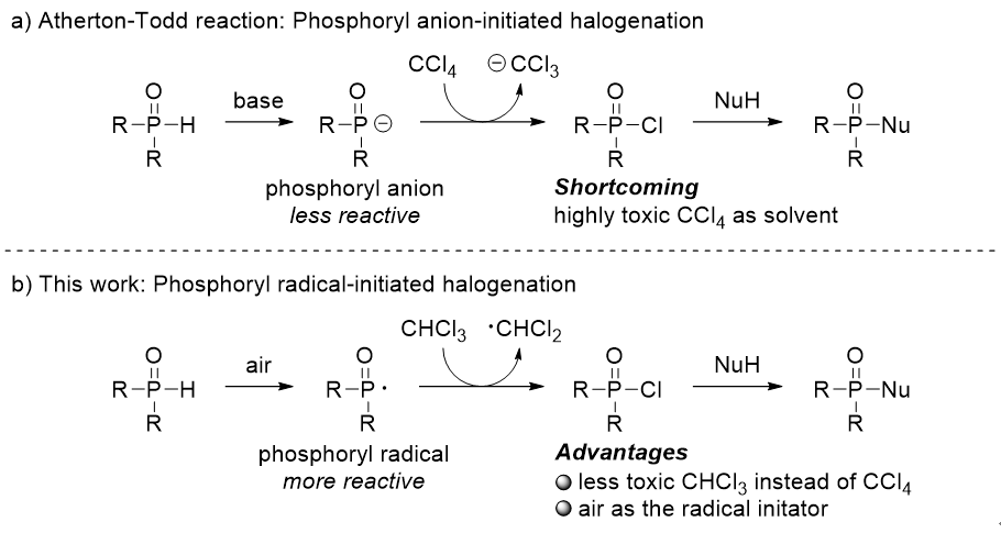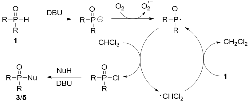 该反应以空气作为自由基引发剂,P(O)H化合物在空气下发生自氧化作用产生磷自由基。随后,高活性的磷自由基攫取氯仿中的氯原子现场生成磷酰氯,同时产生的二氯甲基自由基可进一步攫取P(O)H化合物中的质子产生新的磷自由基。最后,磷酰氯与亲核试剂作用生成磷酰化产物(Scheme 2)。该方法较传统的Atherton−Todd反应具有如下优势:1)以1当量较低毒性的氯仿代替高毒性的四氯化碳(反应溶剂);2)以环境友好的空气作为磷自由基引发剂;3)多种合适的反应溶剂;4)底物适应性广;5)10克级反应规模。