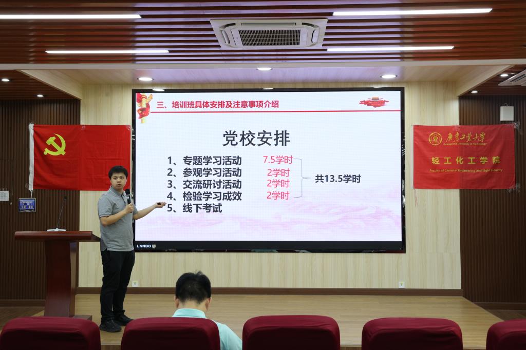 随后,轻化党建指导老师冯浩宸向同学们介绍了培训班具体安排及注意事项,并鼓励同学们要学会化被动为主动,主动思考,主动学习,充分利用这次培训机会提升党性修养。