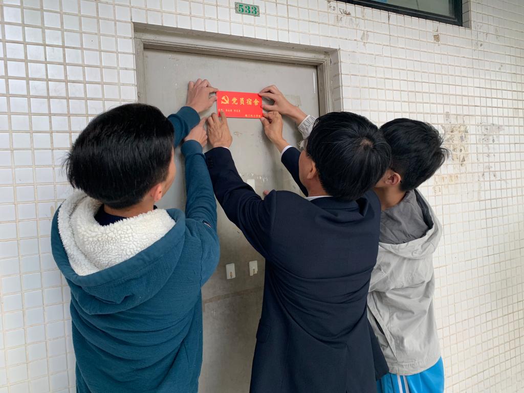 党委书记周东斌、副书记邱伟青、团委书记张明、党建指导老师毛元渊、付志滨等老师,来到学生党员宿舍,与学生党员一起参与“党员宿舍”挂牌活动。