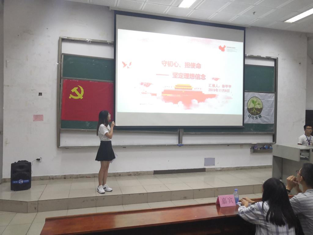 首先,学生党员徐甲甲从四个方面介绍了为什么要坚定自己的理想信念。她以《人民的名义》中赵德汉的例子说明部分党员干部精神的迷茫、信仰的缺失;从周恩来总理的故事阐述了“为中华之崛起而读书”的含义,通过这两个事例的对比,显现出理想信念的重要性。同时,徐甲甲师姐希望大家能够携理想信念,砥砺前行。