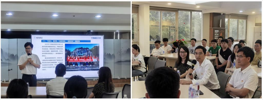 交流会上,梁建龙分享了天赐材料党支部在党建活动、组织建设、党纪活动等方面的开展情况。他表示,企业与高校在党支部活动建设方面有诸多相似之处,希望校企多多交流学习,为双方带来更多的共建机遇和合作空间,推动校企共同进步。史利涛介绍了天赐材料的发展历程、战略布局、成果转化以及人才需求,期待通过深化校企合作,吸引更多优秀毕业生加入天赐材料。他提醒学弟学妹,在求学阶段,除专业知识、科学研究外,还要注重创新综合素质的提升,团队协作、统筹规划等实际应用技能的塑造与培养。柳晨醒与宋旻子陌立足岗位研发方向,深入阐述了天赐材料及研究院的主营业务与创新研发优势,并结合自身实际分享了就业经历与职场感悟。在场师生与企业代表围绕党建与业务深度融合、专业技能提升以及创新能力培养等方面展开了探讨和交流,现场氛围轻松融洽,反响热烈。