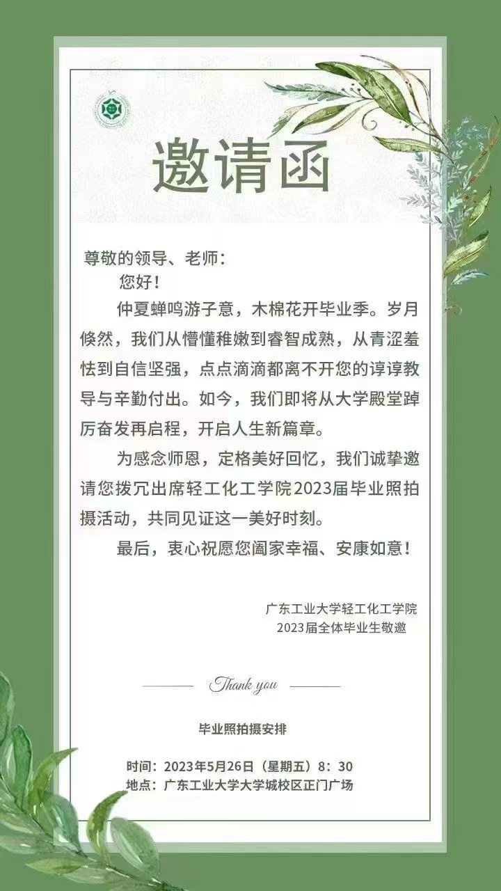尊敬的领导、老师: 您好! 仲夏蝉鸣游子意,木棉花开毕业季。岁月倏然,我们从懵懂稚嫩到睿智成熟,从青涩差怯到自信坚强,点点滴滴都离不开您的谆谆教导与辛勤付出。如今,我们即将从大学殿堂踔厉奋发再启程,开启人生新篇章。 为感念师恩,定格美好回忆,我们诚挚邀请您拨冗出席动漫狂 2023届毕业照拍摄活动,共同见证这一美好时刻。 最后,衷心祝愿您阖家幸福、安康如意!