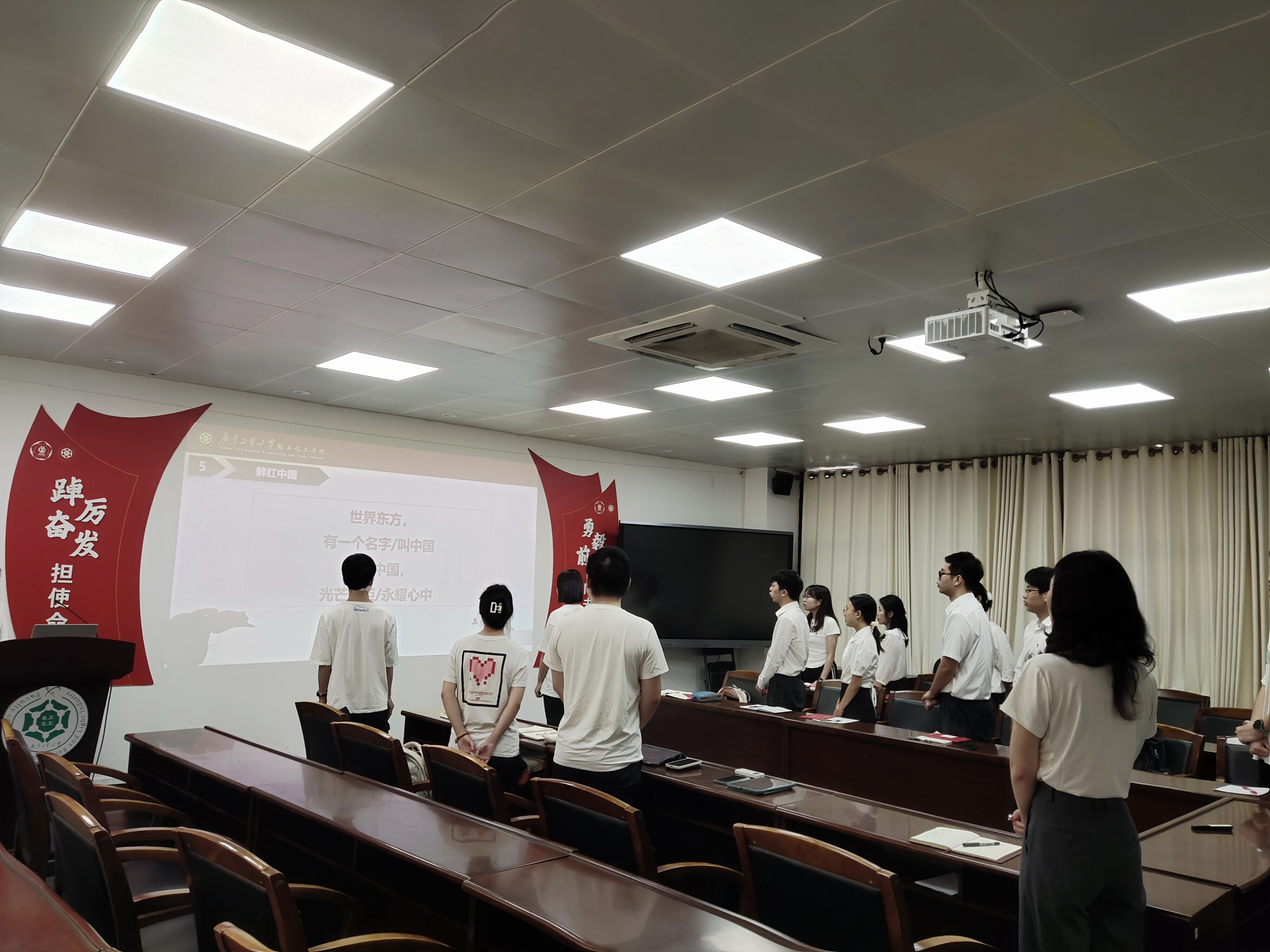 读一首爱国诗词坚定信念。今年是中国人民共和国成立七十五周年,回望来路,苦难铸就辉煌;展望前途,光明引领未来。由叶同欣同学和曾庆彬同学带领支部成员朗诵《鲜红中国》,“世界东方,有一个名字叫中国,鲜红中国,光芒如炬,永耀心中”,支部成员以饱满的热情和强烈的情感,歌颂出对祖国母亲的爱,激励着支部成员奋勇向前,为党和国家作出贡献。
