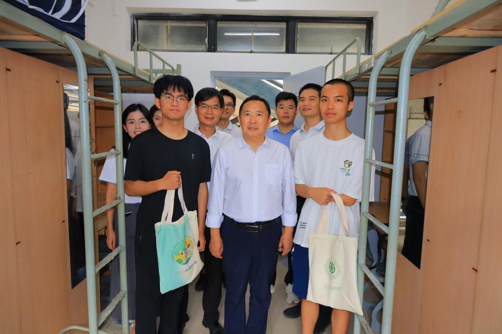 8月31日早上9时许,学校校长邱学青、党委副书记陈卓武一行来到学院学生宿舍看望新生,“同学们还习惯吗?”“今天天气炎热要多补充水分,注意防暑”,邱学青校长与新生们亲切交谈。同时,他寄语新生,“同学们要保持良好的生活习惯和作息规律,以健康的体魄和积极的心态勇敢追梦、砥砺前行,以实际行动不负韶华、逐梦攀撑,做挺膺担当的新时代好青年。”