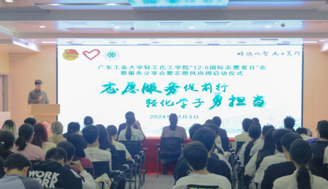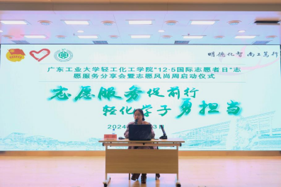 为深入学习贯彻党的二十届三中全会精神,全面落实习近平总书记关于志愿服务系列重要指示批示精神,弘扬志愿服务精神,营造人人参与志愿服务的良好氛围,在第39个国际志愿者日来临之际,轻化学院于12月3日下午,在文化活动中心青春报告厅举行“12·5”国际志愿者日志愿服务分享会暨志愿风尚周启动仪式。第十五运会和残特奥会广州赛区执委会、广州市团校志愿工作部刘婷老师受邀为轻化学子围绕全运会志愿服务经历与收获做分享,并与现场学生深入交流互动。学院党委副书记杨刚、学院团委书记李韵捷、学院辅导员林依慧、校院青志负责人以及学院优秀志愿者代表出席会议。会议由辅导员张昊昀主持。