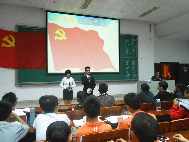 党章知识竞赛决赛在5号大课室拉开帷幕。参赛队伍、班级啦啦队及现场观众非常积极踊跃,赛场气氛高涨。本次竞赛主要以ppt问答的方式进行,分必答、选答、抢答三个环节。参赛选手全力以赴答题,比分你追我赶,现场观众连连喝彩为比赛掀起一阵阵高潮。在观众互动环节,同学们也尽自己所知努力答题为班级加分,在热烈而愉快的气氛中学习党章知识。经过一番激烈角逐,14级应化(3)班参赛队伍凭借扎实的党章知识和策略得当的答题方式,最终脱颖而出荣获一等奖,应化(4)班和应化(1)班分别获得二等奖和三等奖,其余7支参赛队伍获得优秀奖。