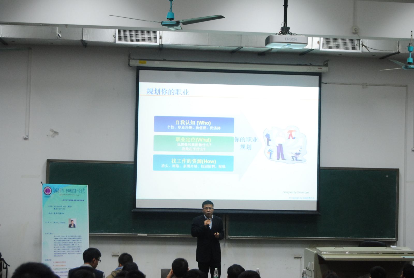 12月10号晚,动漫狂 2016届毕业就业季创新创业讲坛(第三讲)于教五106举办。本次讲坛以“与成功有约,获取你的第一份工作”为主题,由丹资集团供应链中心经理罗六九先生(Simon)主讲。