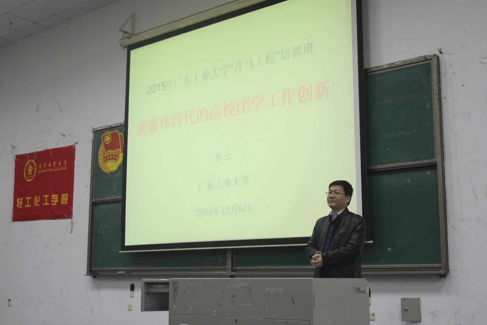 第三讲,乐云副教授授课题目为《新媒体时代的高校团学工作创新》。他首先谈及了外界对广工的调侃和误解,并一一做出了幽默风趣的回应和澄清,他提出广工近几年来一直坚持着建设高水平大学的发展方向和办学理念,并且正在稳步朝着高水平大学的方向发展,这极大地增强了同学们的自信心。接着,乐云副教授为我们带来了两方面的内容,一是为何要当及如何当好学生干部。他指出,部分学生干部存在功利性强、自以为是、拉帮结派、缺乏服务意识等问题,希望作为学生干部,首先要端正自己的态度,这样才能更好地成为中国未来之路的领导者。二是关于学生干部在新媒体(如微信、微博)运营中存在的问题与对策,乐云副教授通过大量实际案例让同学们深入了解到新媒体的运作,并就如何管理运营好新媒体提出了对策建议。