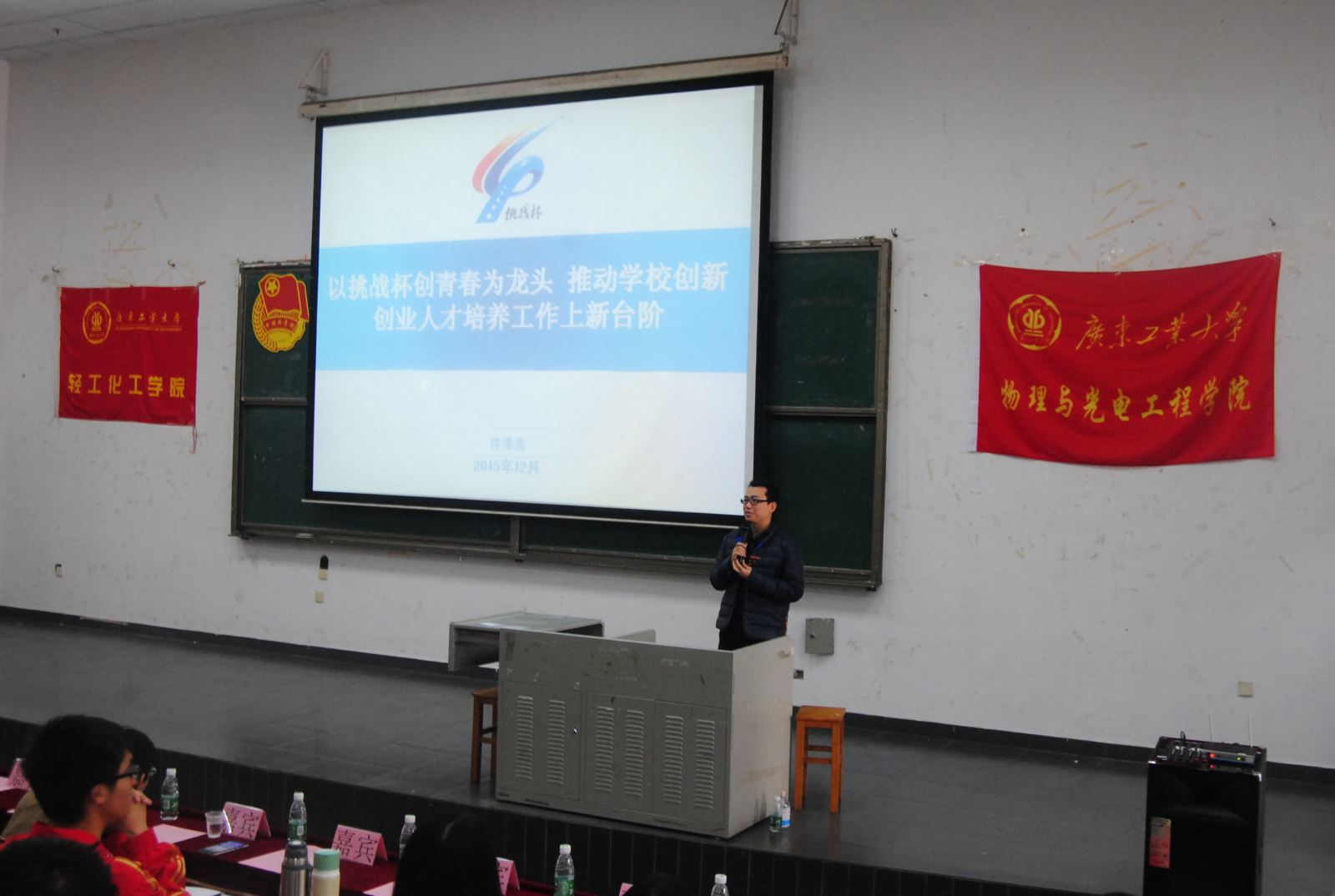 第一讲,是许泽浩副书记带来的《以挑战杯创青春为龙头,推动大学生创新创业工作上新台阶》。许泽浩副书记为我们详细介绍了“挑战杯”的历史、意义,以及2013年我校在申办“挑战杯”过程中的艰辛。他提到,得益于前期准备工作充分,我校举办的第十四届挑战杯取得了巨大的成功,开闭幕式被部分更是被誉为“历届最好的开闭幕式”。接着,许泽浩副书记借“挑战杯”提出:“是平台造就你,而非你造就平台”,当一个学生干部的意义是磨练自身,收获友情,大家应珍惜几十个年轻人一起奋斗的时光,享受小组合作的美好岁月。最后他祝愿所有“爱马仕”在人际、工作、学习中都有所成就。