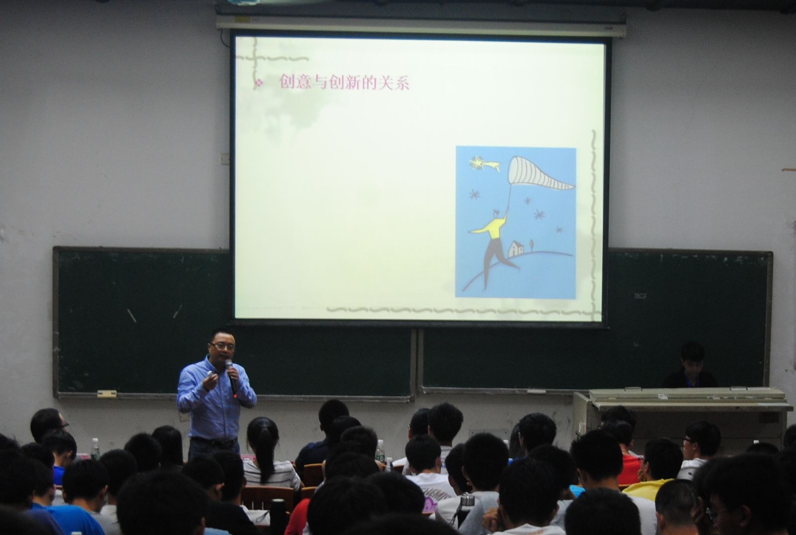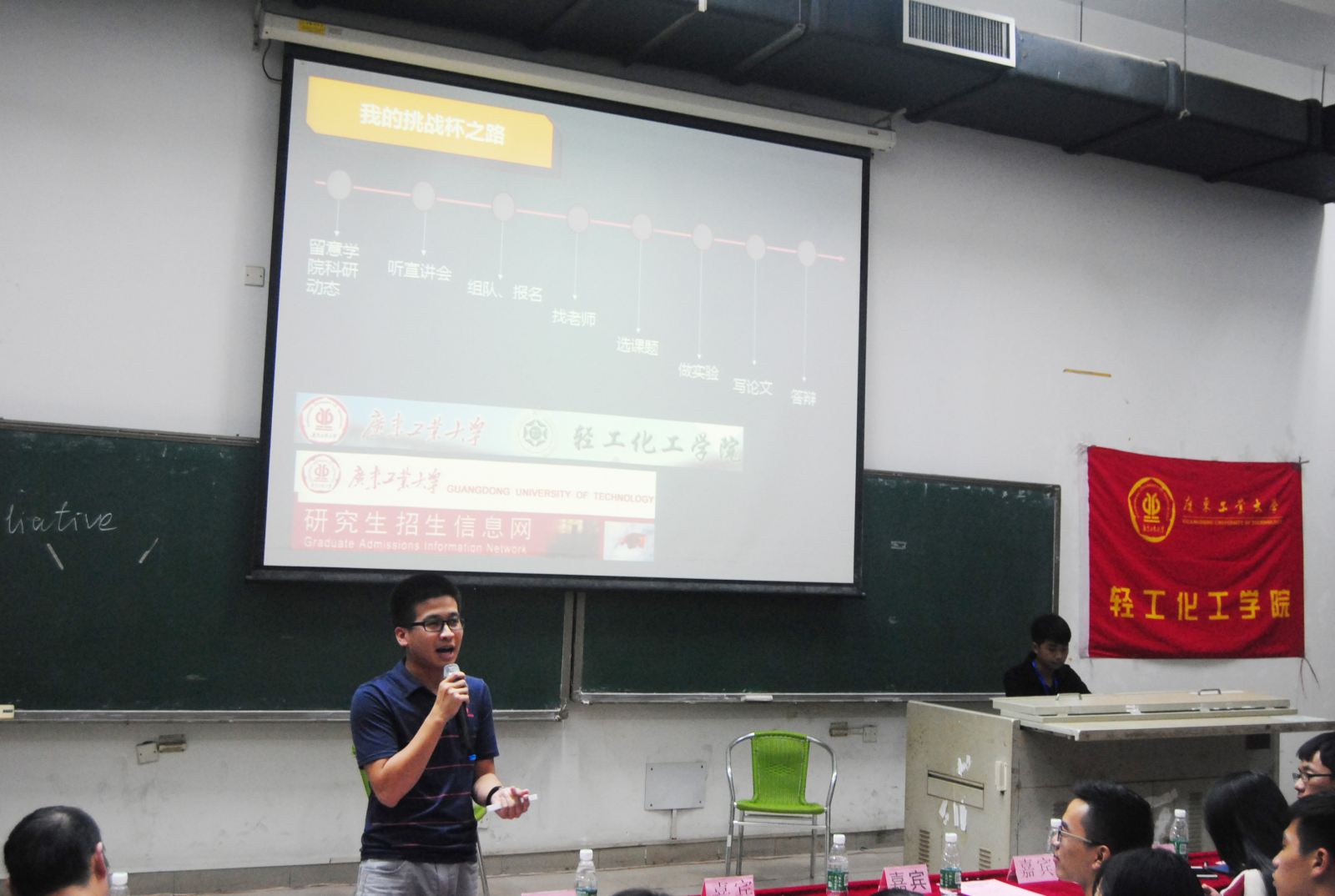 黄浩炜同学分享了自身从科技创意大赛起步,通过“挑战杯”校赛,挺入“挑战杯”省赛并收获骄人成绩的苦与乐。他认为,路途虽艰难,但这都是值得的,是一段难得的经历。他给大家提出了几点建议:做事之前要有“燕雀安知鸿鹄之志哉”的自信与热情;做事之时要心平气和,不论成功或失败都要学会审视自己,吸取教训;最后,感激帮助过你的人,做到“认取来时路”。黄浩炜同学淡然、幽默的语言让同学们倍感亲切,跃跃欲试,收到了非常好的宣传鼓动效果。