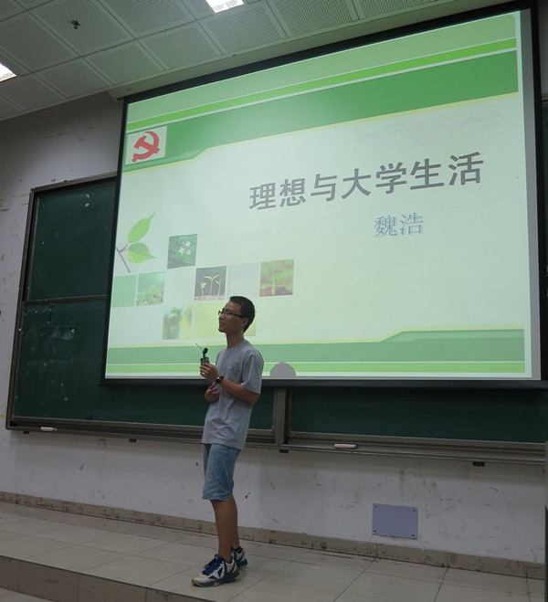 学生党员魏浩围绕大学生活与理想追求这一主题,阐述了他对于理想的认知,并通过对比理想与梦想、目标的异同,让大家进一步了解理想的定义和内涵。他把理想比喻成北极星,比作人生的参照系,认为大学是迷茫与不断认清自己的过程,经此四年的历练最终朝着理想展翅高飞。最后他提出只有正确树立理想信念,人生才能充满不竭动力,以此勉励大家合理规划、努力践行,脚踏实地朝着目标奋进。