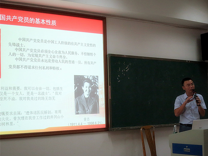 发展学生党员工作实施办法》,并特别指出办法中新的要求和做法,以帮助同学们了解从递交入党申请书到成为一名党员各个环节的程序与要求。他深入浅出地总结为“十六字总要求”和“两个适度”,并重点阐述了“结构”与“质量”两个关键词,引导同学们了解优化党员结构、提高党员质量的重要意义。在介绍中国共产党党员的基本性质时,汤老师生动地讲述了中共党员曽志同志的感人事迹,以她舍己为人、无私奉献的高尚人格引导同学们感知作为一名共产党人的理想信念。最后,汤老师介绍了近年我校学生党员的基本情况和接下来的党员发展计划,勉励大家求真务实、积极进取,扎实开展党章学习小组工作,深入学习党的理论知识,努力成为一名品学兼优的好学生。