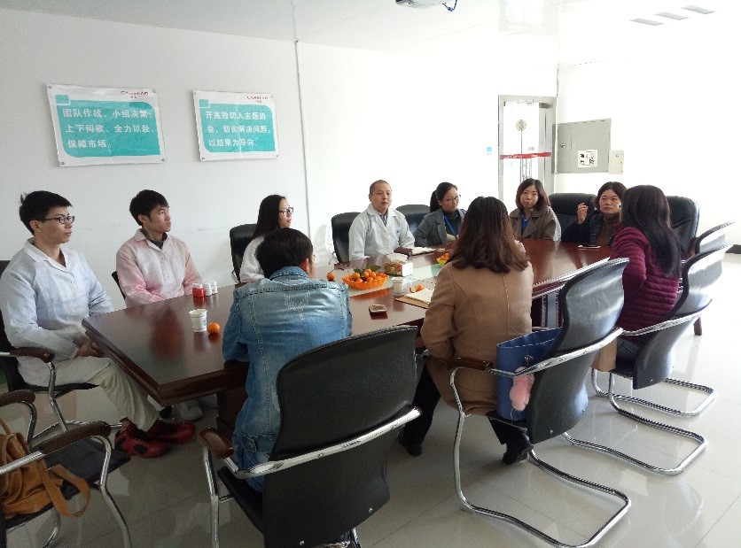 2018年1月11日上午,动漫狂 基础教学中心余倩老师,谢珍茗老师连同两名研究生,来到动漫狂 创新班“3+1”培训基地——广州卡迪莲化妆品有限公司,与公司研发总监黄红斌女士,膏体产品、乳化产品及粉体产品核心研发人员交流讨论,并参观了基地的研发中心。