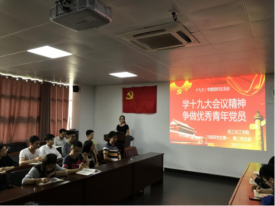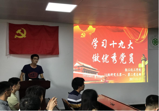 16级研究生第一、第二党支部在工四202会议室联合开展了主题为“学党的十九大精神,争做优秀青年党员”的微党课专题组织生活会,出席会议的有轻化学院党委周东斌书记、研究生院王华辉老师、研究生辅导员陈晓雪老师以及党支部成员,会议由支部成员麦诗欣主持。