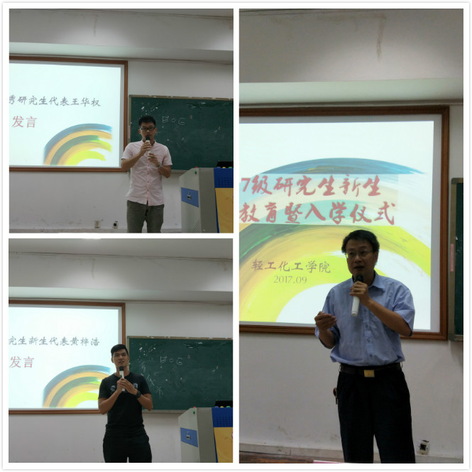 导师代表潘湛昌教授从自身经历体会出发,阐明建立良好的师生关系对科研成功的重要性。优秀研究生代表王华权和新生代表黄梓浩也相继上台发言。王华权同学鼓励大家培养良好的科研兴趣和科研习惯;黄梓浩同学则表达了自己对研究生生活的憧憬和规划