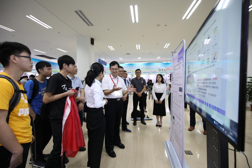 在参赛作品展示现场,学校党委副书记、纪委书记汤耀平、学校团委书记许泽浩、副书记王亚煦亲临作品展位进行慰问指导,就项目进展和临场答辩等与团队成员进行了亲切交流。学院党委书记周东斌、副书记邱伟青、指导老师籍少敏到现场为同学们加油打气,并对项目进行指导与完善。