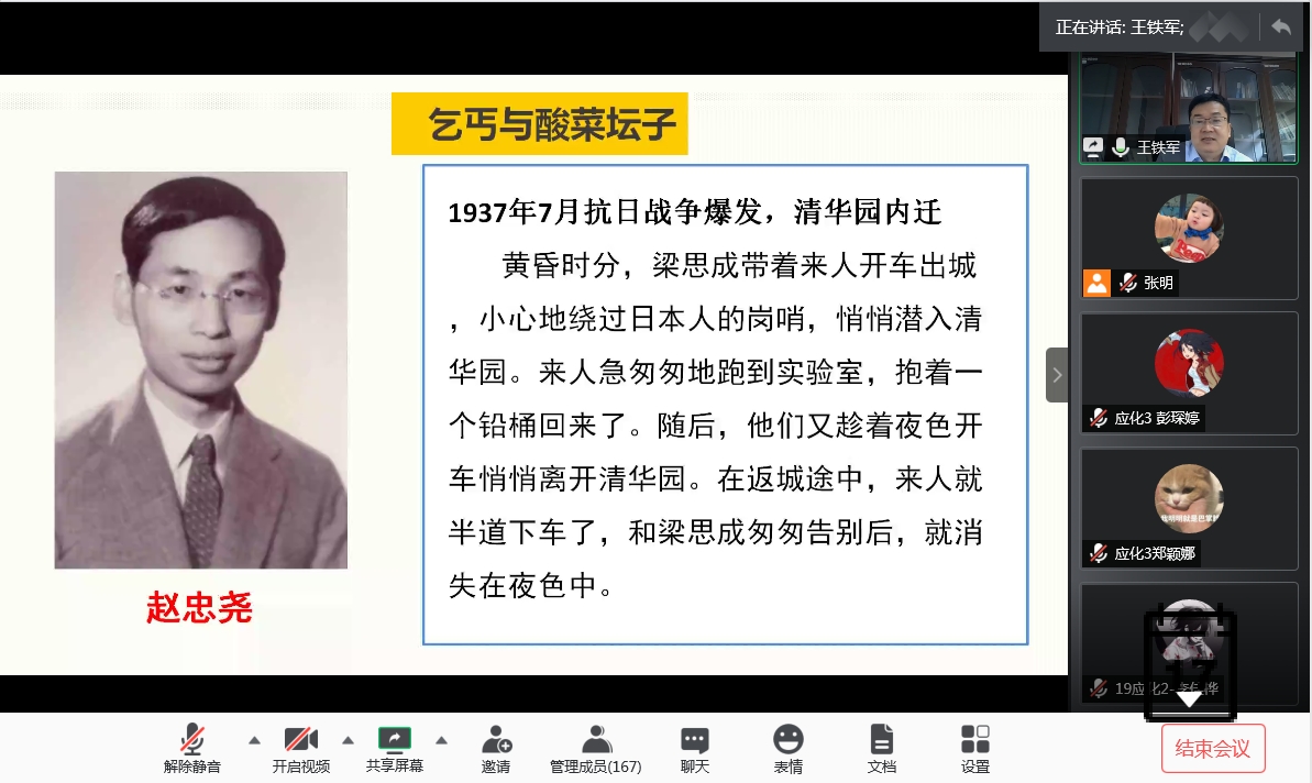 周东斌书记围绕“在疫情大考中彰显中国特色社会主义制度优越”这一主题,从集中彰显制度的五大优势、五个角度理解制度显著优势、着力把制度转化为治理效能和广工师生齐心战疫四个方面展开,结合国内外新闻报道、鲜活案例分析、详细的抗疫数据,向同学们展现了中国特色社会主义制度的优越性和责任担当的大国形象,强化了学生们的国家自豪感与民族自信心。王铁军院长分别以抗战时期、建国初期、建国后抗美援朝战争以及新时期国家重大科研项目中,我国科学家发扬民族精神的实例谈起,为大家展现了一幅科学家救亡图存的宏伟画卷,并围绕疫情防控中“最美逆行者”的感人事迹,引导同学们思考如何弘扬新时期爱国主义精神,为打赢这场疫情防控阻击战做出青年学生的应有贡献。