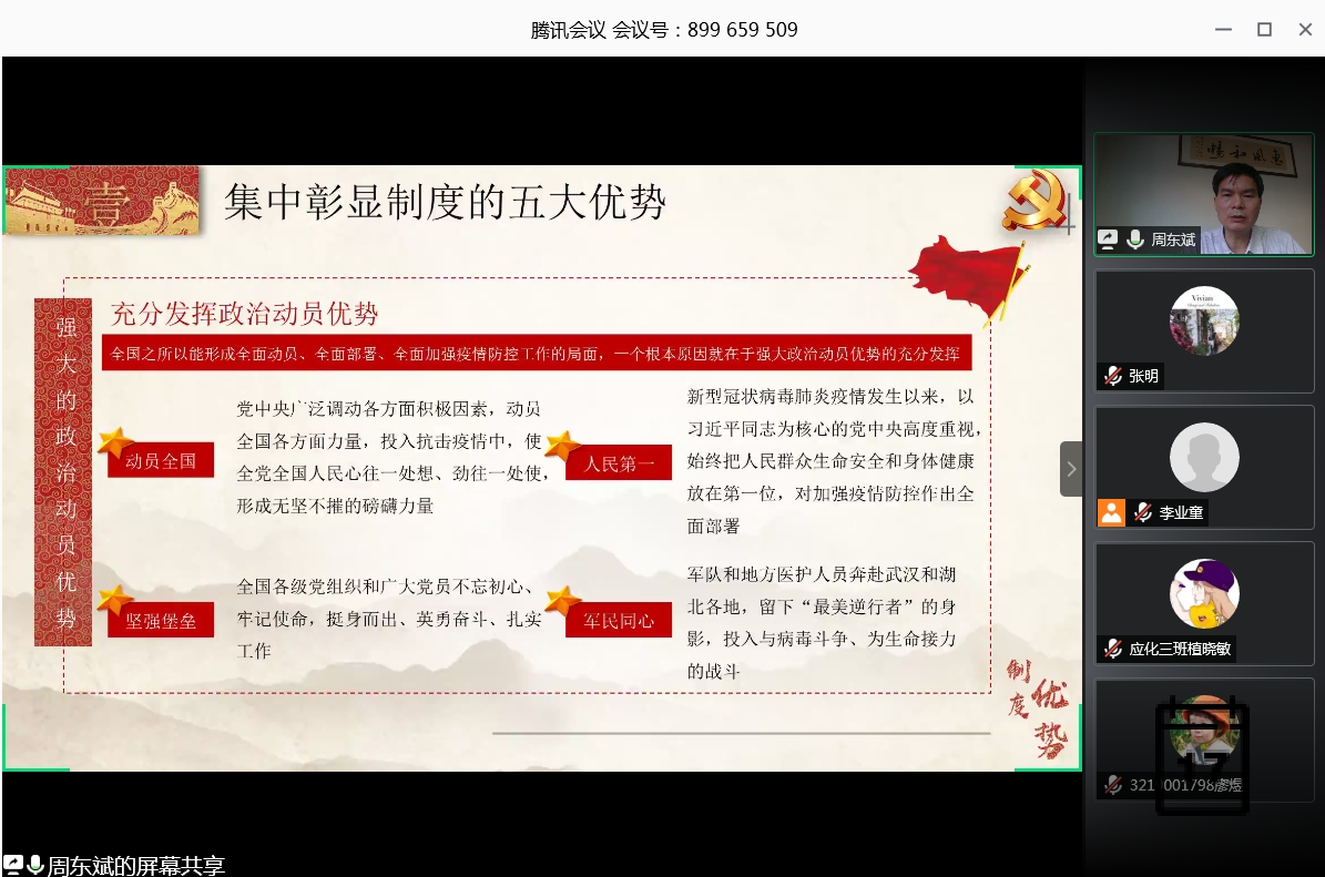 本次“云端”思政课,拉近了师生之间的心理距离,让同学们充分认识到党和国家抗“疫”的强力举措,坚定了理想信念,激发了爱国爱党爱社会的巨大热情。