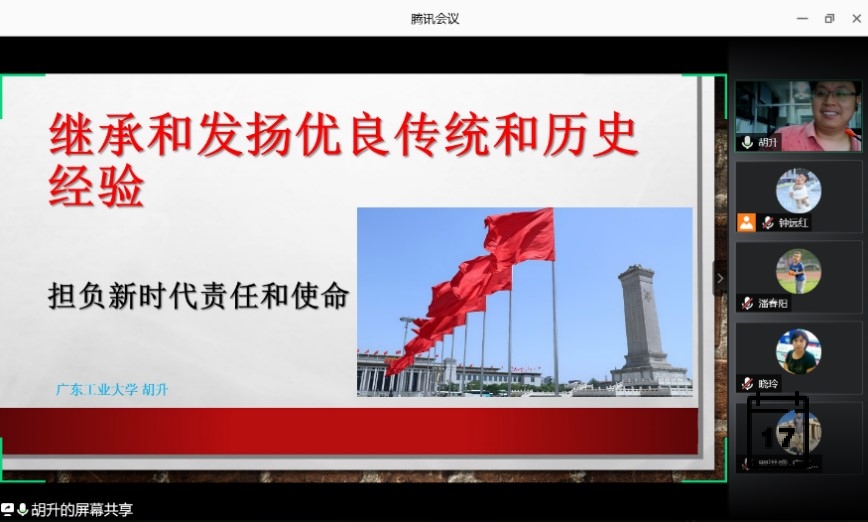 紧接着,胡升教授作了题为《继承和发扬优良传统和历史经验——担负新时代责任和使命》分享,胡教授讲述了中国致公党的发展历史、政治地位,从疫情看中国制度的三点优势,再结合全国“两会”中应对新冠肺炎疫情方面的提案谈了几点体会,并表示“疫情当下,做好本职便是担当。”