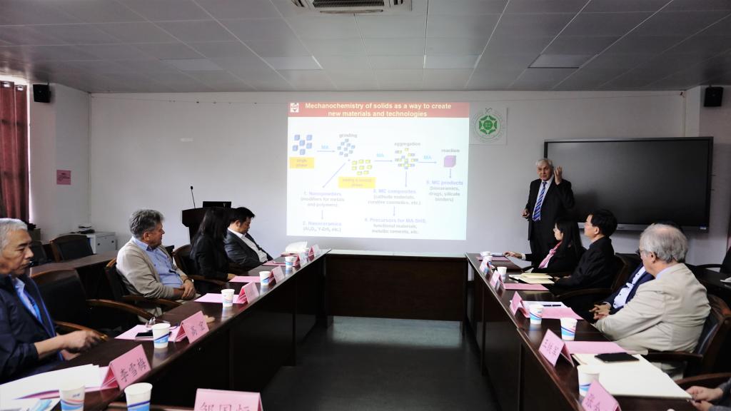 进行学术交流并商谈举办机械化学技术基础国际会议相关事项。同行来访的专家有:大连交通大学高宏教授、弗拉迪米尔生物科技有限公司吴涛总经理、广东科泰信息科技有限公司林汉文总经理、AEIC学术交流中心李雪梅主任等。国际处副处长曹锋、交流科科长李蕾,我校特聘教授莫涅院士,学院王铁军、周东斌、何军等相关领导和老师参加此次会议。