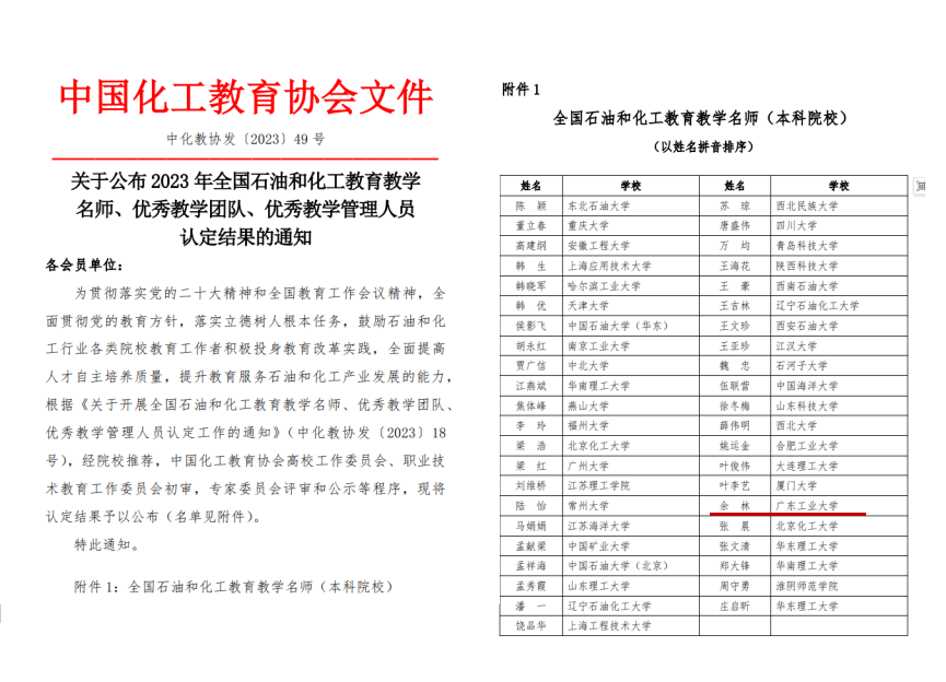 近日,中国化工教育协会公布了2023年全国石油和化工教育教学名师、优秀教学团队的认定名单,动漫狂 余林教授荣获2023年“全国石油和化工教育教学名师” 荣誉称号。