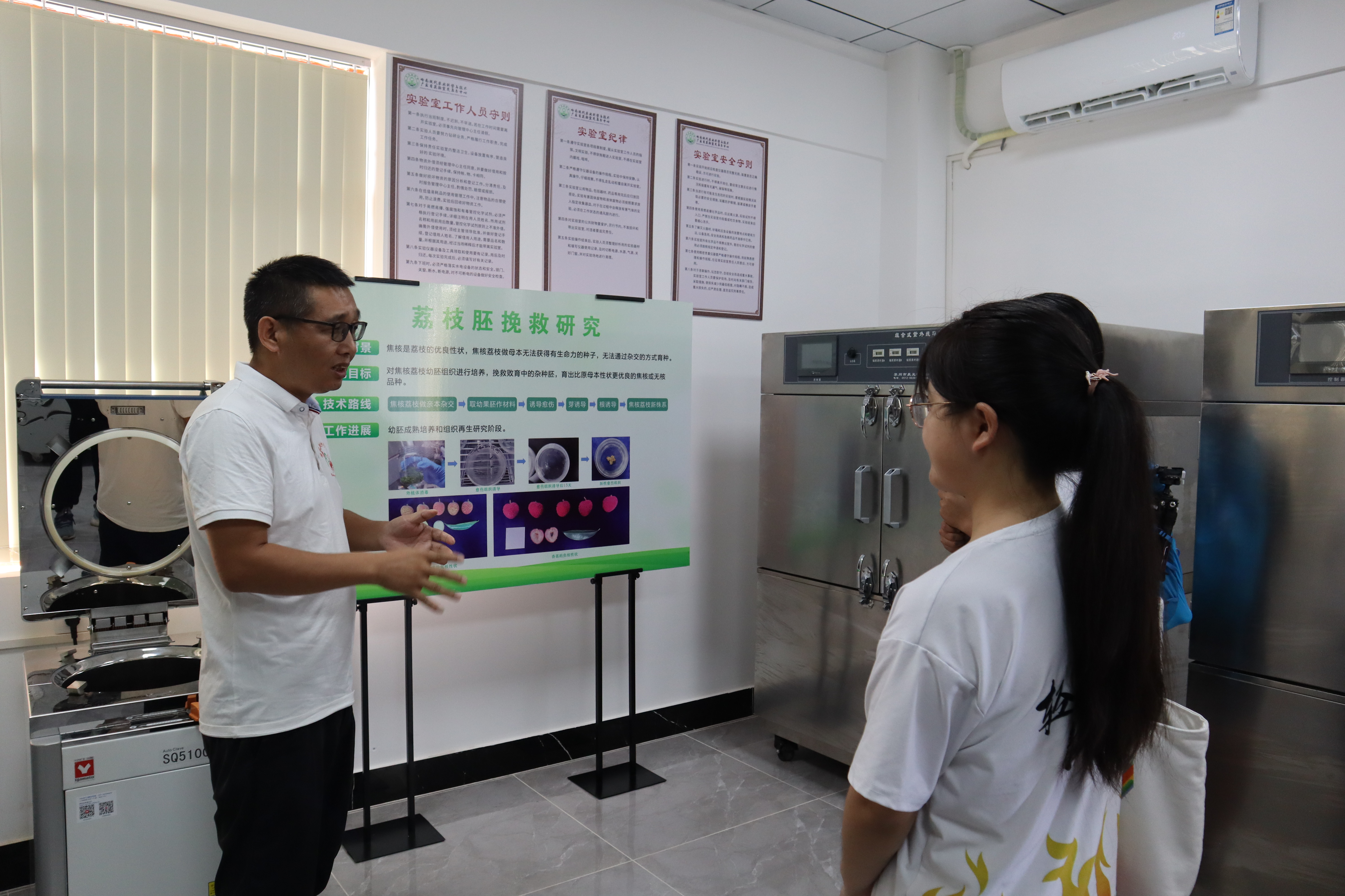 在实验室研究员、高级农艺师赵俊生的带领下,实践团来到岭南现代农业科学与技术广东省实验室茂名分中心。实践团成员参观了荔枝研发实验室、设备展示区和国家荔枝种质资源圃,详细了解了荔枝的生长过程、病虫害防治措施以及品质改良技术,并就品种改良、冷藏保鲜、病虫害防治等与研究员进行了深入交流。