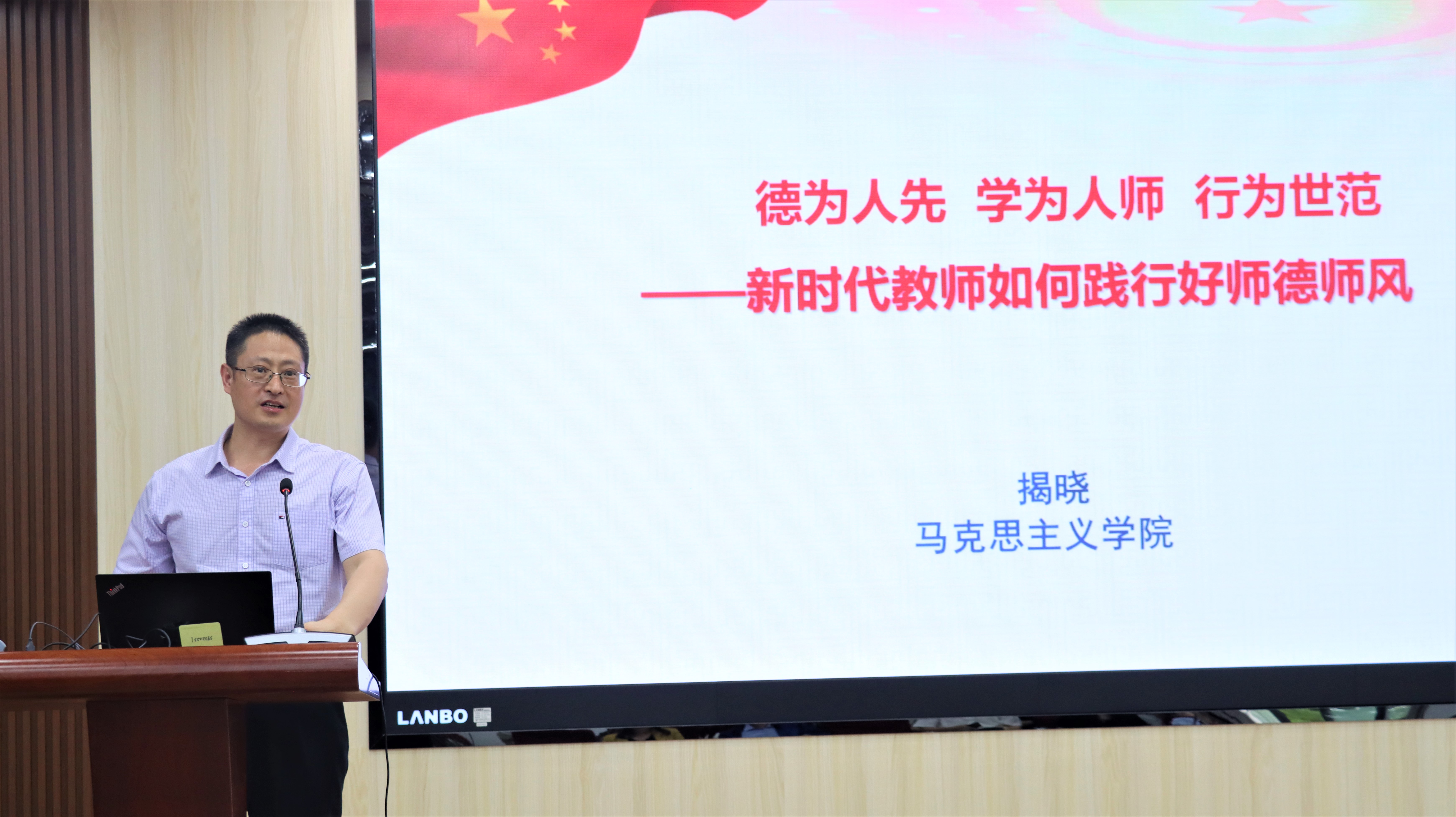 揭晓教授以《德为人先 学为人师 行为世范——新时代教师如何践行好师德师风》为题,分别从习近平总书记关于师德师风建设的重要论述、新时代加强师德师风建设的基本要求、自觉践行新时代“四有”好老师三个方面进行分享。