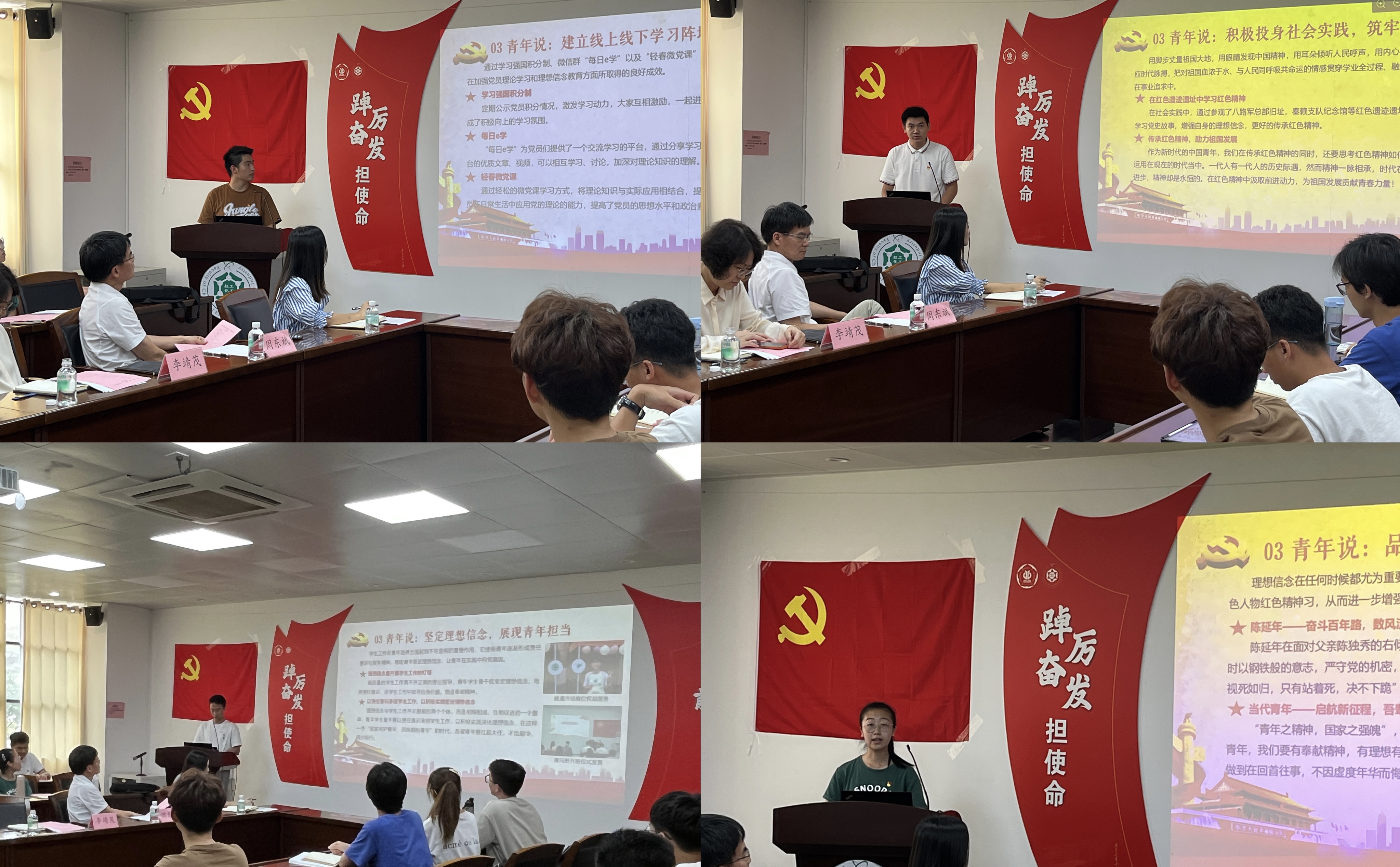 随后,支部党员代表进行《学深悟透新思想,争做新时代有为青年》主题学习分享,分别围绕社会实践、学生工作、阅读红色经典等方面分享加强理想信念教育的方式,引导全体党员认识理想信念教育的重要意义。
