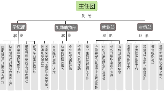 轻化学工会根据学生日常管理服务需求设置学纪部、奖勤助贷部、就业部和宣策部共四个部门,具体职责如下: