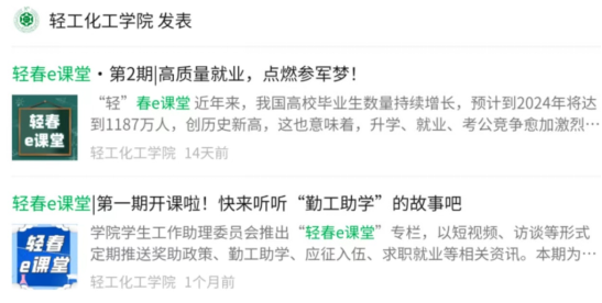 轻春e课堂是为学生提供学生掌握各类资助政策、就业升学资讯的线上专栏,每月以访谈、短视频、趣味图文等形式定期推送奖助政策、勤工俭学、应征入伍、求职就业等相关资讯,增强政策普及度及覆盖面。