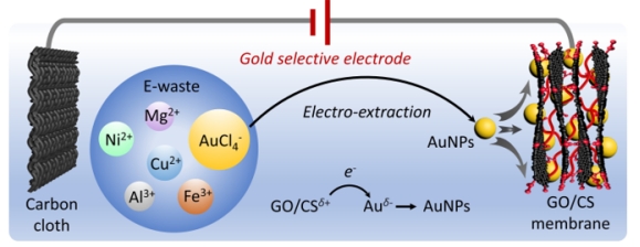 在PNAS发表的研究工作中(如图1),研究团队开发了一种纳米级的复合材料,由二维氧化石墨烯和一维壳聚糖大分子自组装而成,可以同时作为金离子的捕集剂和还原剂。这种创新材料能够从电子废物中同时回收和还原Au³⁺和Au⁺离子,生成固态Au⁰。更为重要的是,这个过程不需要施加任何电压,仅依赖于金离子在氧化石墨烯/壳聚糖纳米空间中的化学吸附动力学及其在多个结合位点上的化学还原。这种离子吸附中的协同效应使得金的提取效率极高。其提取能力对于Au³⁺达到16.8 g/g,对于Au⁺达到6.2 g/g,这都是现有任何金吸附剂的十倍以上。提取效率超过99.5 wt.%(目前的极限为75 wt.%),在低至3 ppm的金浓度下也能实现有效提取。这种金回收的创新研究不仅提高了电子废液中金属的回收效率和可持续性,也标志着二维复合材料在自然资源保护方面的重大进展。