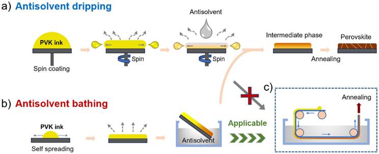 Figure1. Theschematics of deposition processes for perovskite films prepared by a) antisolvent-dripping-assisted spin-coating method; b) antisolvent-bathing-assisted self-spreading method. c) R2R processing of perovskite layer via antisolvent bathing method.