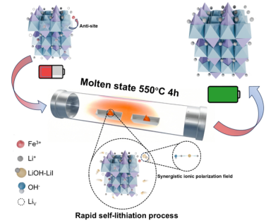在新能源产业快速发展的背景下,废旧磷酸铁锂电池的回收利用是实现资源闭环循环、推动行业绿色可持续发展的关键环节,具有重要战略意义。然而,废旧磷酸铁锂修复过程的核心瓶颈在于元素价态的精确调控与锂空位的高效补偿。针对上述S-LFP结构修复的核心挑战,本研究首先系统深入剖析了磷酸铁锂电池中“锂离子缺失诱发的失效机制”,并基于此构建了一种基于偶极化学的修复策略。具体而言,研究依托双共晶锂盐(LiI-LiOH)的偶极化学特性,通过元素价态的精准调控与晶格位点的特异性操纵,实现了S-LFP晶格结构的有效修复,进而高效消除锂空位与锂-铁反位缺陷。此外,鉴于S-LFP的损伤主要集中于颗粒表面区域,表面缺陷的高效修复是晶格重构过程高效推进的关键前提。为此,本研究基于离子-偶极相互作用创新性构建了离子极化协同场,有效提升了体系整体的电子耦合效率与Li+扩散速率。进一步研究表明,S-LFP中锂晶格位点的缺失会破坏其本征高度对称性晶体结构,在锂空位区域诱导形成局部偶极矩,且正电荷中心倾向于在此区域富集;这一结构特征使得离子极化协同场的负电荷中心(I-)可对S-LFP中的晶格缺陷位点实现精准靶向作用。最终,仅在550℃下保温4h即可完成对S-LFP的修复,修复后LiFePO4电池展现出优异的电化学性能:在10C倍率下循环1000次后,其容量保持率仍可达82.4%。