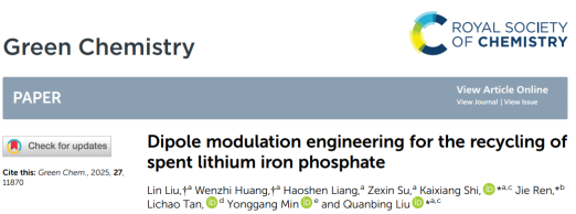 2022级能源化学工程一班本科生刘琳,以第一作者身份在化学领域国际知名期刊Green Chemistry(《绿色化学》,IF=9.2)上发表最新研究成果。该研究聚焦废旧磷酸铁锂正极材料高效回收领域,提出双共晶锂盐偶极调控工程技术,实现废磷酸铁锂电池高效回收,论文题为“Dipole modulation engineering for the recycling of spent lithium iron phosphate”。