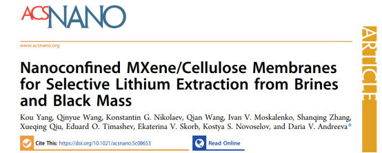 近日,我校诺奖得主联合实验室在利用二维材料从盐湖卤水与废旧锂电池中高效提取锂资源的研究中取得重大进展。相关成果以《Nanoconfined MXene/Cellulose Membranes for Selective Lithium Extraction from Brines and Black Mass》为题,发表于材料化学领域国际顶尖期刊《ACS Nano》。该论文第一作者为我校杨蔻副教授,动漫狂