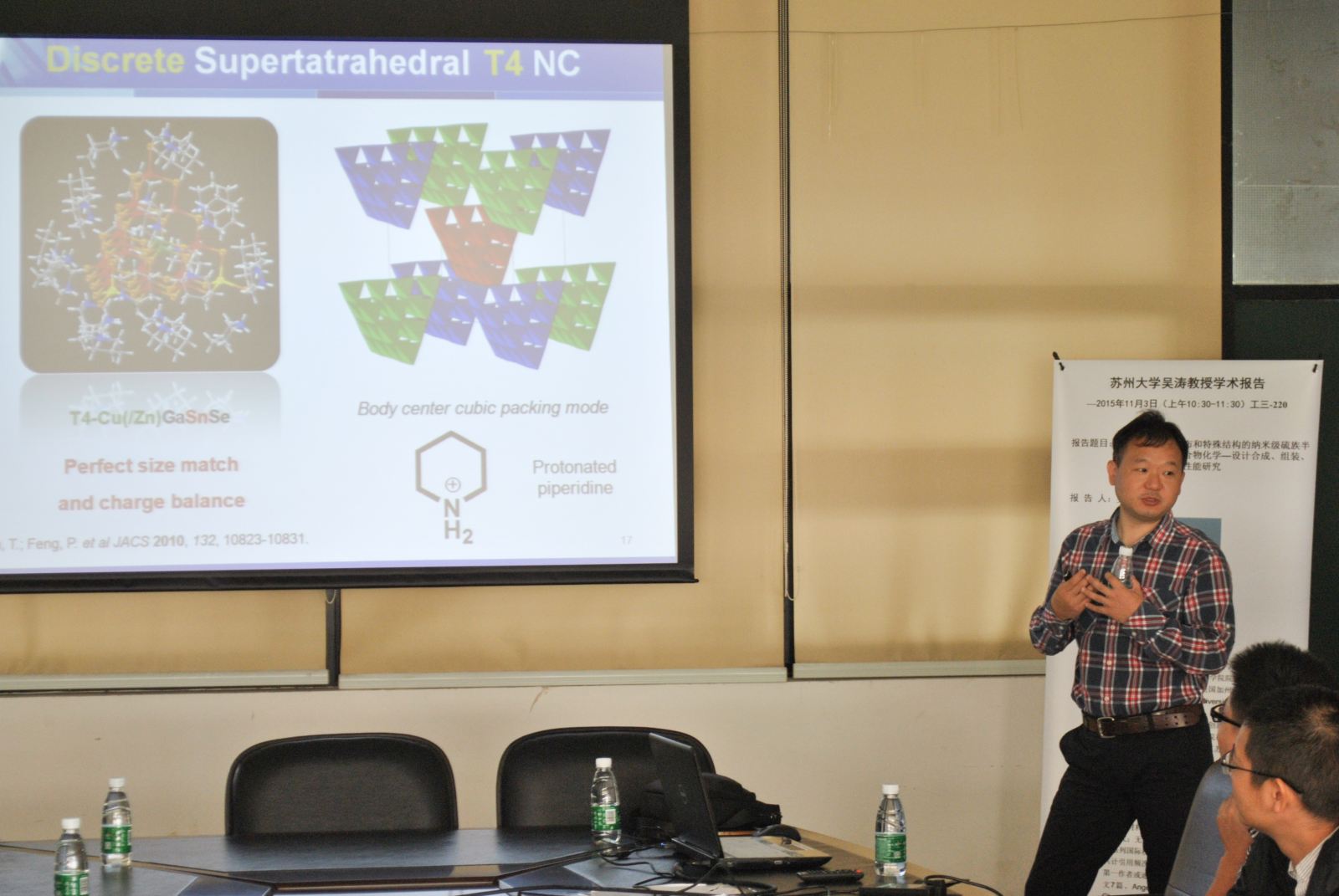 吴涛教授为在座师生作了题为《具有硫族半导体体相材料规则碎片结构的纳米团簇——设计合成、组份调控、精确掺杂和光电性能研究》的学术报告。首先,吴涛教授提到硫族半导体材料的纳米化和功能化一直是纳米材料及其相关应用学科领域的研究重点和热点,但有关其精确结构、组成及构效关系等基础问题的研究还非常有限。接着,吴涛教授阐述了传统硫族半导体体相材料的亚纳米结构单元(即碎片结构或纳米团簇)的合成设计、组份调控等方面的研究思路,概括了超四面体规则碎片结构单元的组装和晶格中的离散化,并重点介绍了多元组份在纳米团簇中的分布规律以及组份精确掺杂。最后,吴涛教授简要说明了此类纳米团簇的固态材料在荧光、光电响应、电催化和电化学发光等方面的应用。
