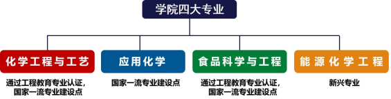 学院各专业特色鲜明,知名度高。化学工程与工艺专业,2010年入选国家特色专业,2019年通过教育部工程教育专业认证,同时入选国家一流专业建设点;应用化学专业,2019年入选国家一流专业建设点,坚持学以致用,与我校印制电子电路产业学院密切结合,办学特色鲜明;食品科学与工程专业,2021年通过教育部工程教育专业认证,并入选国家一流专业建设点;能源化学工程专业,是根据新时代国家能源发展战略于2020年设置的新兴跨学科专业。