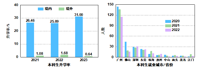 毕业生升学率和就业情况理想,考研升学率稳步上升,2023届本科生升学率创历史新高,达31.6%。部分学生考入北京大学、浙江大学、中国科学院过程工程研究所、中国科学院大学、中国科技大学、香港大学、哥伦比亚大学、爱丁堡大学、曼彻斯特大学等国内外知名学府以及科研院所继续深造。就业前景广阔,就业率一直保持在98%左右。90%以上毕业生在珠三角就业,分布于政府部门、各级学校、科研院所、知名企业等单位,为广东、粤港澳大湾区乃至全国的能源、化工、食品、材料、化妆品等行业输送了一批又一批高素质创新型人才。