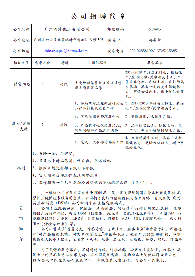 2018届毕业生招聘信息(二十):广州润沛化工有限公司