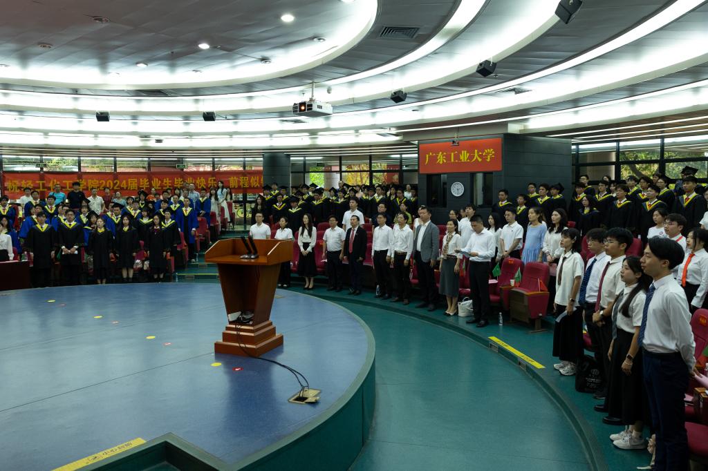 仪式最后,全体师生起立奏唱校歌《逐梦》,“立大志,勇担当,工大学子美名扬。求卓越,步步高,扎根南粤铸辉煌”。全场轻化人以歌声抒发了爱校荣校的情怀,唱响了对未来的追求,唱响了不负韶华、不负时代的青春强音。