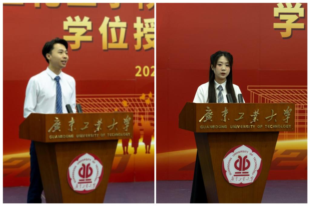 2021级化学工程专业硕士李柱荣作为研究生毕业生代表发言。回望自己在广工大求学的七年时光,收获了无数来自导师和同学的支持与鼓励,他感谢学校学院为自己提供优越的学习环境,感恩学院老师们辛勤耕耘。他表示自己今后将在学院继续攻读博士学位,会时刻牢记轻化学子的使命和责任,继续坚定科创报国的决心,书写担当作为的时代篇章。2020级应用化学专业黄雪儿同学作为本科毕业生代表上台发言。她回顾了求学路上的难忘经历和美好时光,分享了自己大学四年的成长和感悟,她立志“做更好的自己”,始终严格自律、追求进步,并向母校和师长表达了感激之情。她祝愿同学们未来在各自的领域里继续发光发热,矢志不渝地传承广工精神,坚定理想信念,让青春绽放绚丽之花。