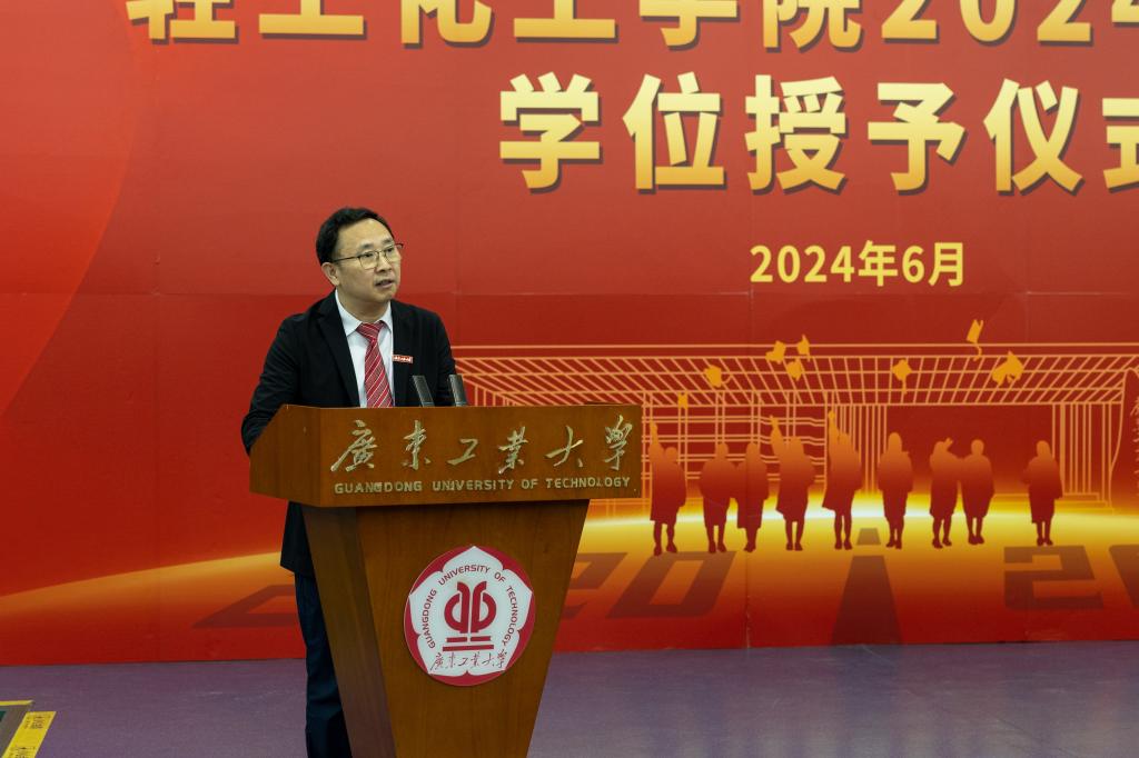 仪式在庄严的《中华人民共和国国歌》歌声中拉开序幕。学校副校长兼学院院长余林代表学院向全体毕业生致以诚挚的祝福和深切的期望。他表示,同学们正身处一个伟大的时代,与新时代的中国和奋力攀撑的广工如约相遇,同风雨、齐奋斗、共担当,见证了属于彼此的成长与收获。他希望各位轻化学子珍惜这个时代,把握发展机遇,直面一切未知和挑战。他寄语全体毕业生:要因势而谋,敢闯敢试,展现青年“有理想”的志气;顺势而为,知行合一,练就青年“敢担当”的锐气;逆势而进,砥砺前行,坚定青年“能吃苦”的勇气;乘势而上,追求卓越,永葆青年“肯奋斗”朝气。他表示母校永远是同学们的家,是大家坚强的后盾,希望毕业生带着母校的期许不断努力,祝愿大家的青春“热辣滚烫”、人生“繁花”似锦。
