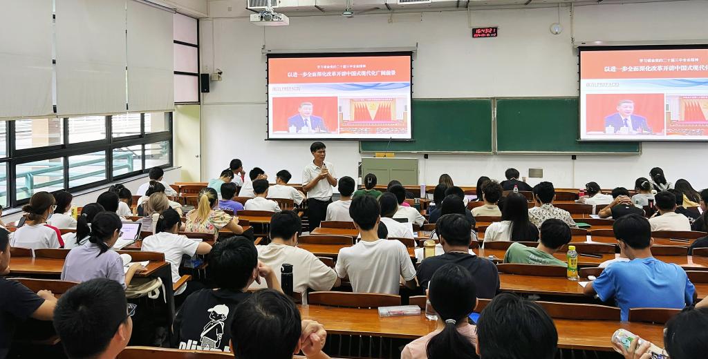 课上,周东斌首先强调了党的二十届三中全会的重要意义,指出这次全会是在以中国式现代化全面推进强国建设、民族复兴伟业的关键时期举行的一次十分重要的会议,是新时代新征程上推动全面深化改革向广度和深度进军的总动员、总部署。他希望全体同学要深入学习领会全会精神,切实把思想统一到党的二十届三中全会精神上来。