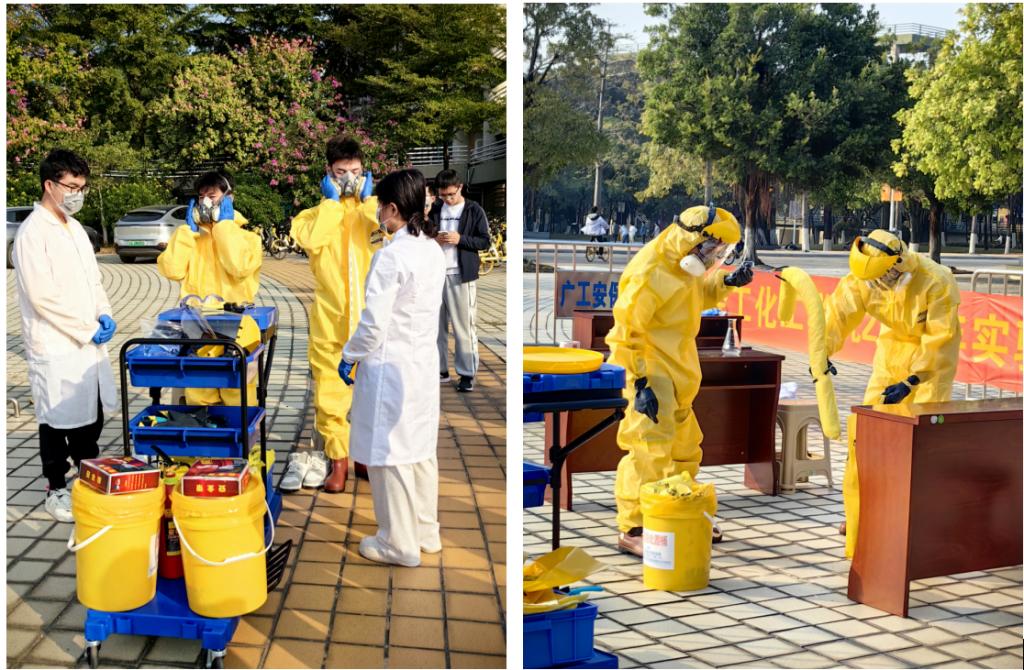 本次活动邀请到江苏君源环保科技有限公司的朱寅飞工程师,他就《实验室事故预防与应急安全处置》进行理论培训,随后指导了实验室危化品泄漏事故应急演练。模拟了实验室中甲醛溶液泄漏的紧急情况,学院十余名师生积极参与演练。通过此次演练,将理论知识与实际操作紧密结合,普及防护用品的实用知识,使师生掌握紧急情况下的应对技能,进一步提高了大家的安全意识、责任感及应急防范能力。
