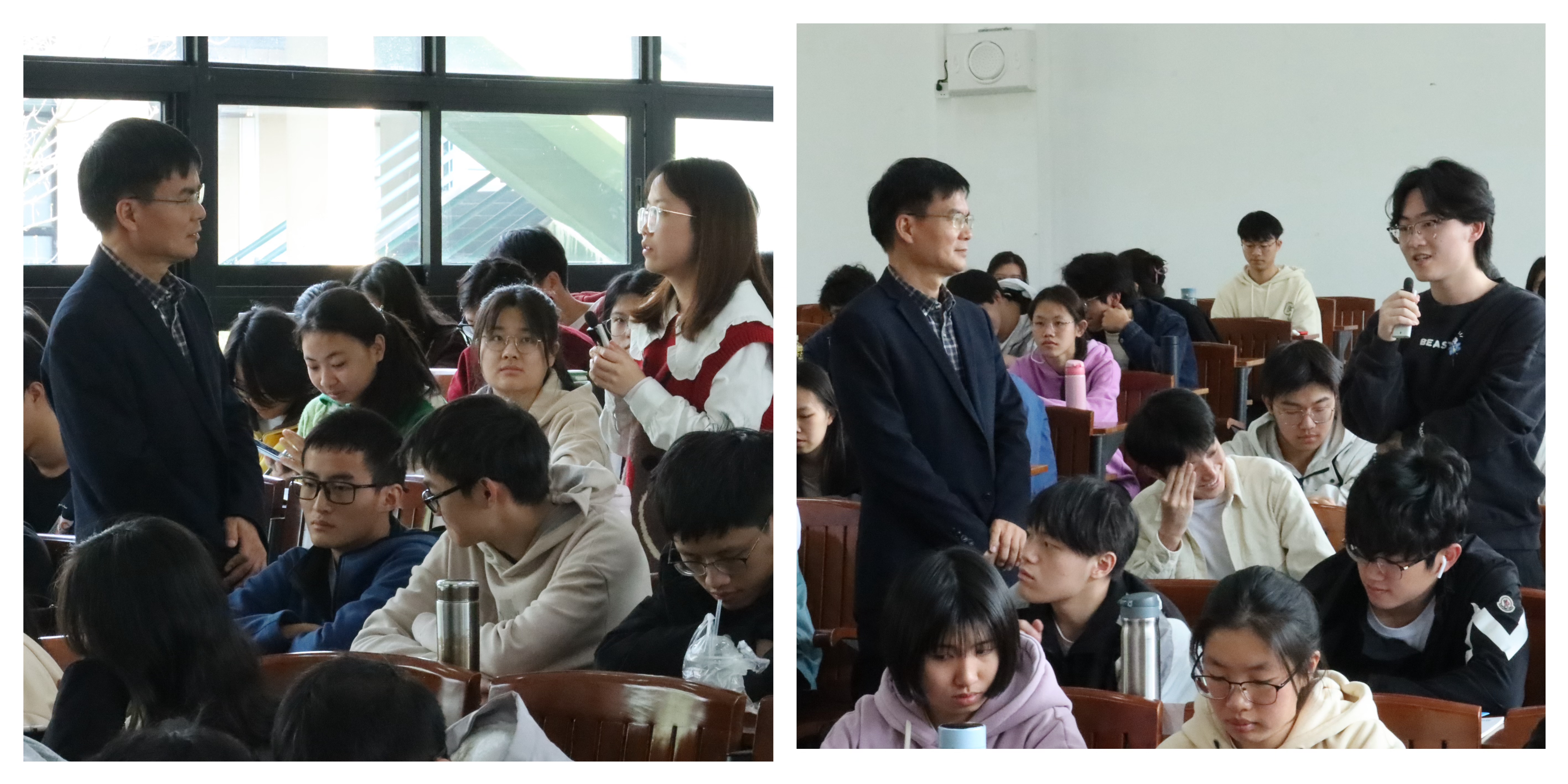 在与学生互动环节,周东斌就同学们关心的话题进行了耐心细致的解答,通过这些问题让同学们深入浅出地理解到“中国共产党为什么是伟大的?为什么是光荣的?为什么是正确的?”同时,周东斌结合新学期学校召开的贯彻全省高质量发展大会精神会议暨2024年学校工作会议精神,介绍了省委和学校对教育发展的新要求,鼓励同学们“乘着学校、学院向上发展的东风”找准人生方向,实现自我价值,为学校高质量内涵式发展贡献我们的青春和智慧。