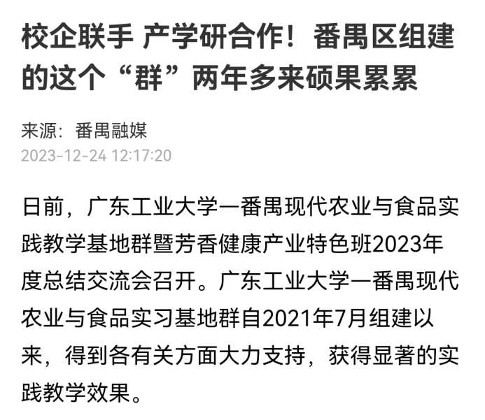 —番禺区现代农业与食品科产教融合实践教学基地群暨“芳香健康产业特色班成立两年多以来的基本情况及工作进展进行介绍和总结。实习基地群现已建成20余个实践教学基地,涵盖现代农业、食品加工、芳香健康等领域。基地群为广工食品专业师生开展实践教学提供了良好的平台,助力学生专业知识的学习和技能的培养。直至2023年底,实习基地群及芳香特色班在教学改革、实践创新课程建设、芳香人才培养、学生创业创新方面取得重大进展,为广工食品学院人才培养、科技创新、社会服务等方面提供了有力支撑。吴教授进一步对基地群及芳香特色班在2024年的工作进行规划,提出将在三个方向推进工作:(1)加强学生进入基地群深度实习与就业;(2)开展老师进基地群作专题报告为企业员工培训;(3)探索基于项目合作促进科产教紧密融合“企业出题-学生答题-老师批改”。他希望基地群和特色班继续发挥优势,为解决企业技术问题,进一步推进科产教融合贡献力量。