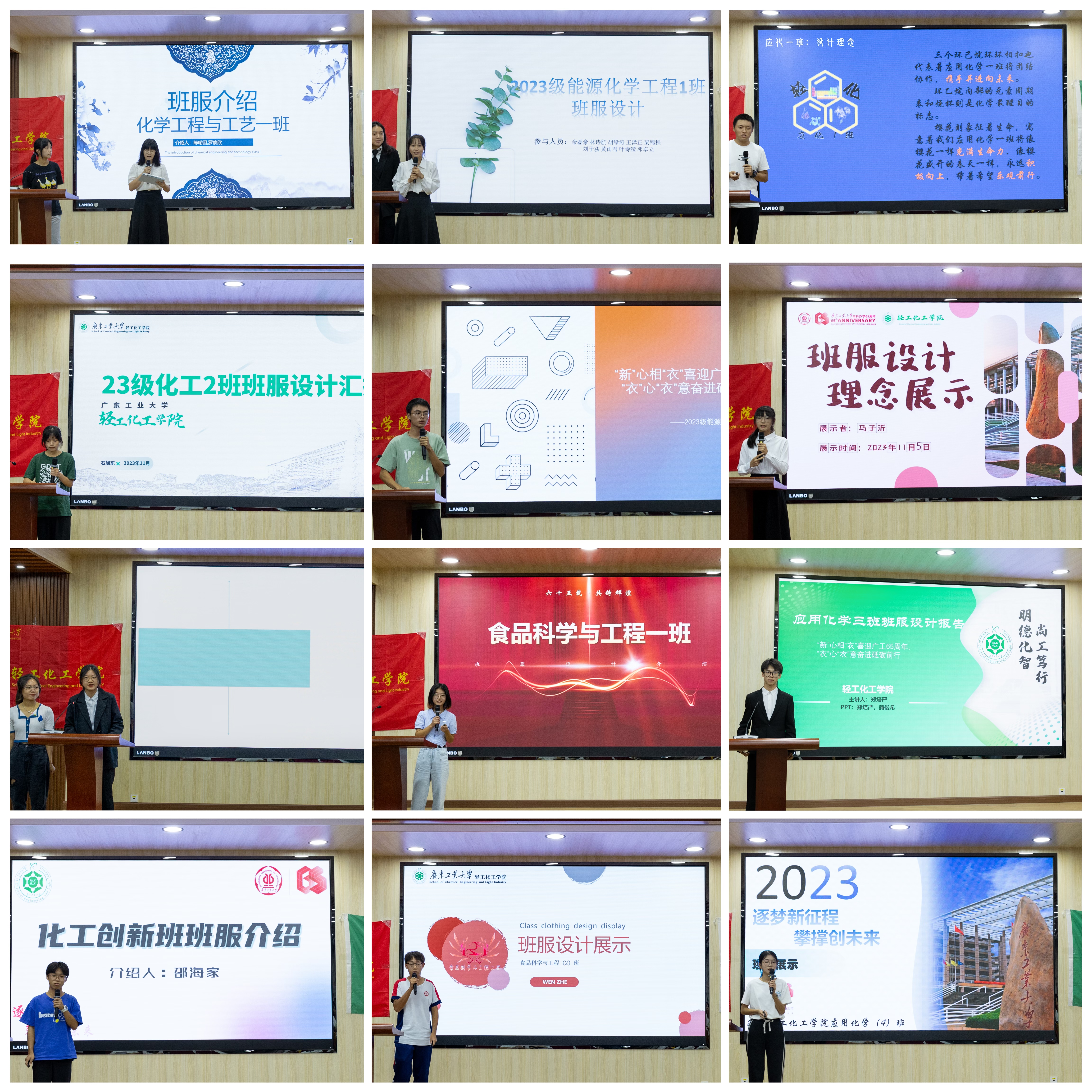 活动伊始,十二个新生队伍依次进行班服设计的展示和答辩。各班级代表结合班服图片,声情并茂地展示班服的设计理念、班级特色、颜色搭配以及与广工大本科办学65周年校庆的结合点,展现了班集体凝聚力及班级文化的创新性、独特性。