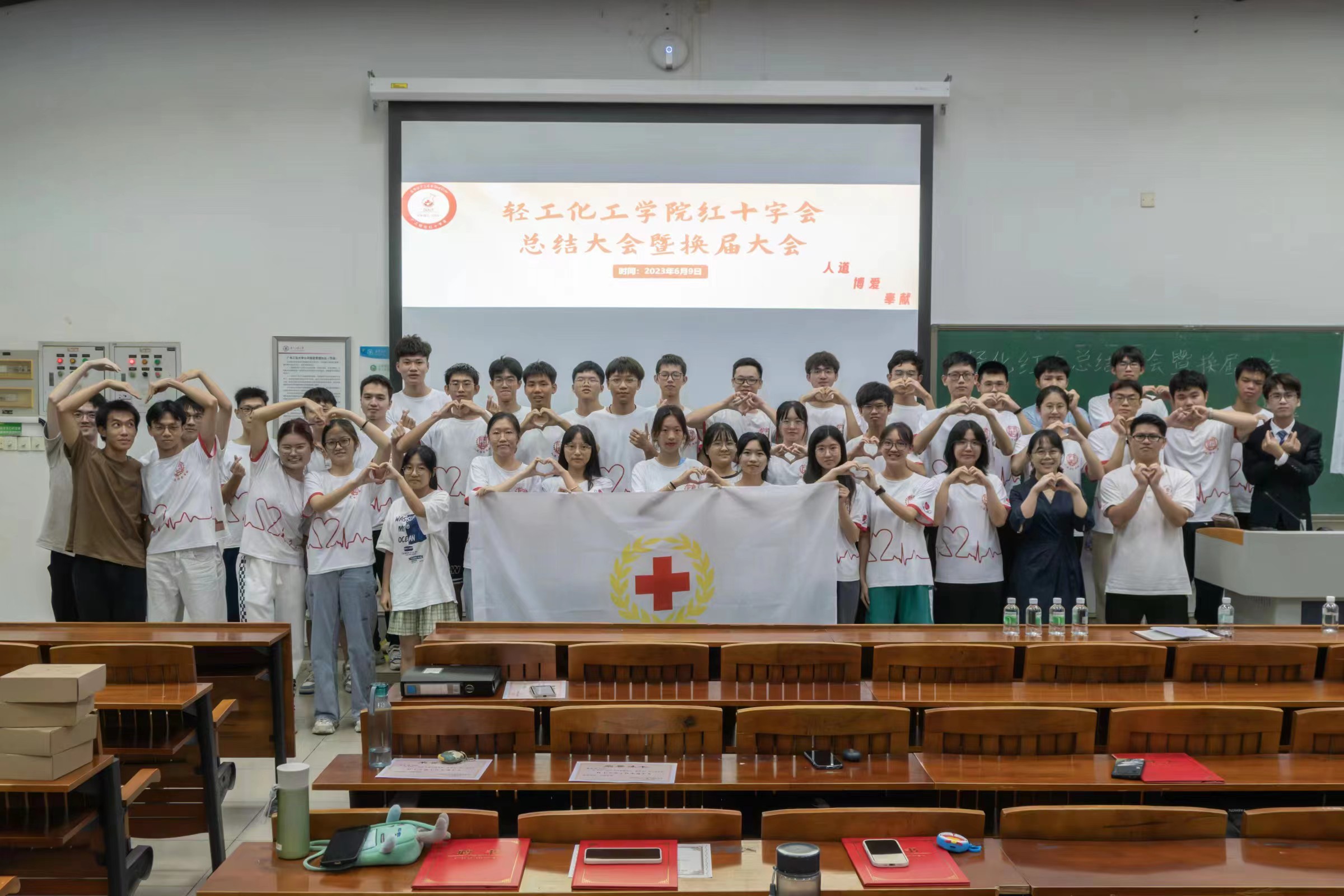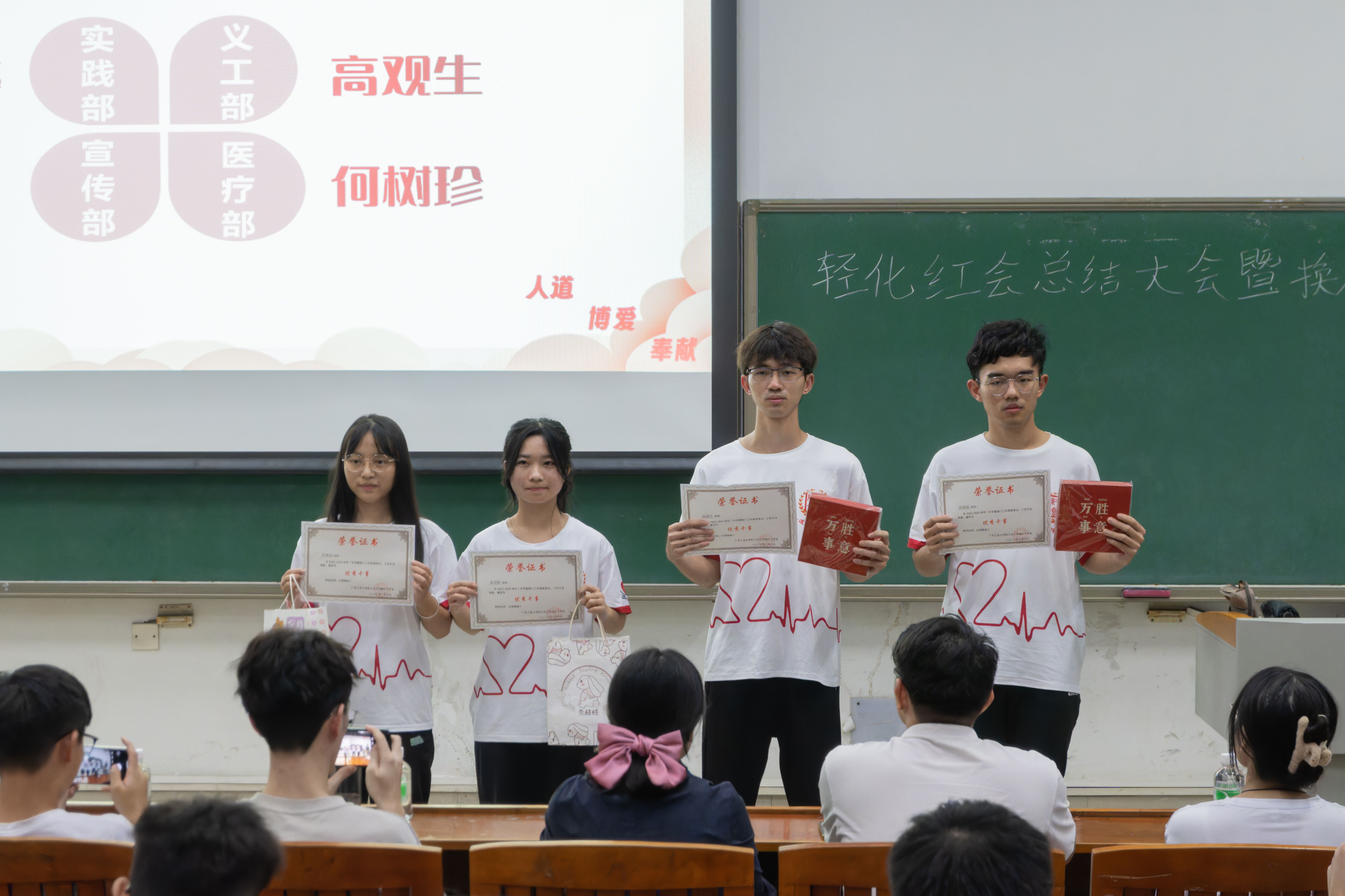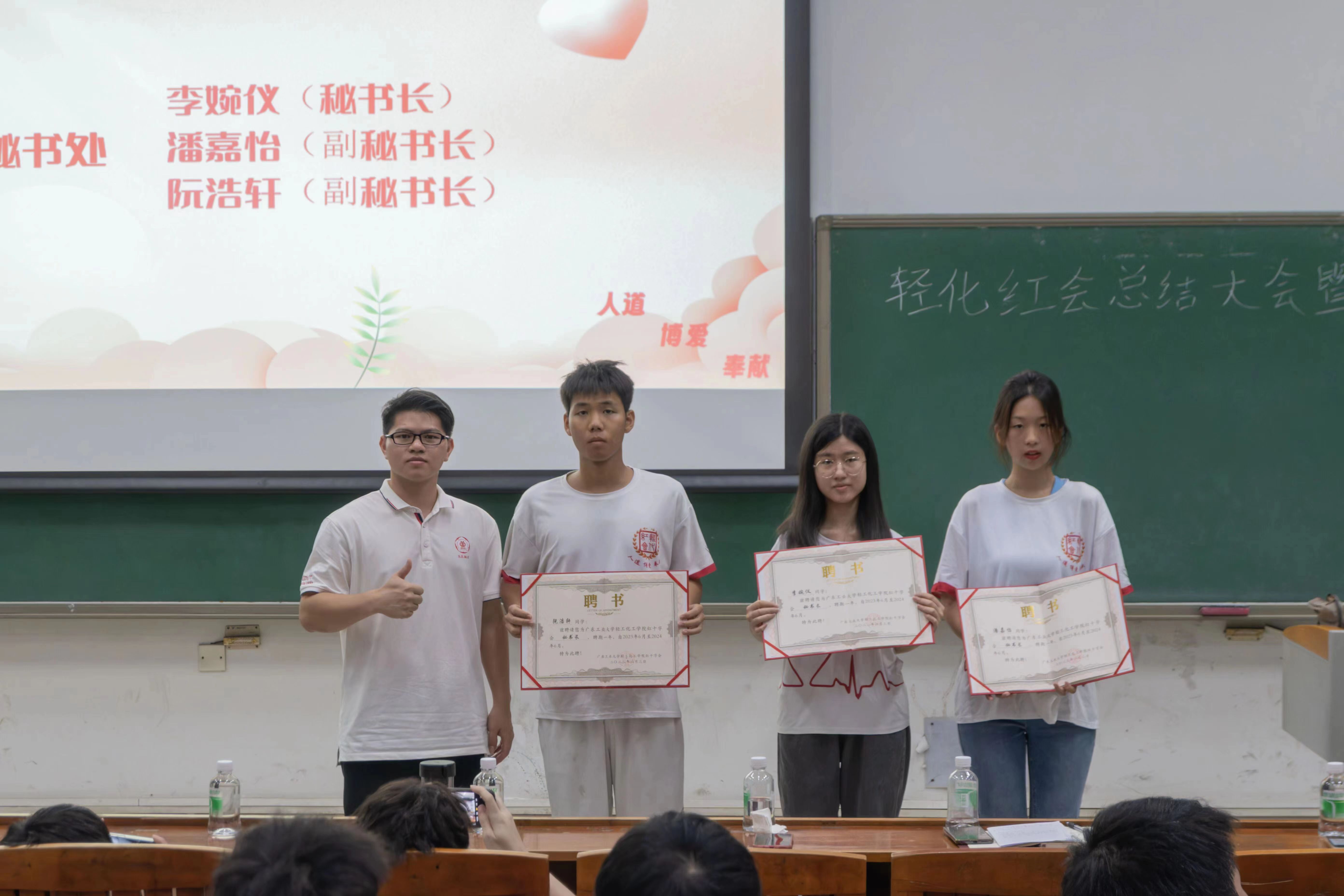 李韵捷老师对过去一学年为学院红会辛勤付出的同学表示肯定,并表达了对红会干事的殷切期盼,希望全体成员能延续前辈精神,为轻化学院学子服务,为建设更好的轻化贡献力量。赖振鑫老师为各部门新任学生干部颁发聘书,给予各部门针对性建议并提出相应的要求,并寄语各位同学时刻牢记“人道、博爱、奉献”的红十字精神,期望新一届的学生干部们秉承务实进取的优良作风,传承红十字会精神,实事求是,承载起老师同学们给予的期望。