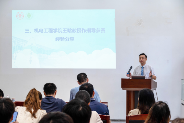 机电工程学院王晗教授结合自己多年来指导学生参赛的亲身经历进行了经验分享。他建议老师们首先要做到“三个不”:科研行动不落单、科研目标不攀比、竞赛过程不着急,参赛过程中做到“三个固定”:竞赛团队人员固定、场地固定和时间固定,积极引导学生做到“三个清楚”:清楚自身能力、清楚团队定位、清楚个人目标,提醒师生们做到“三个联系”:加强学院间的联系、与辅导员的联系、与校团委老师的联系。他鼓励师生们锚定参赛目标,熟悉竞赛规则,持续努力,通力合作,一定能达成预期目标。